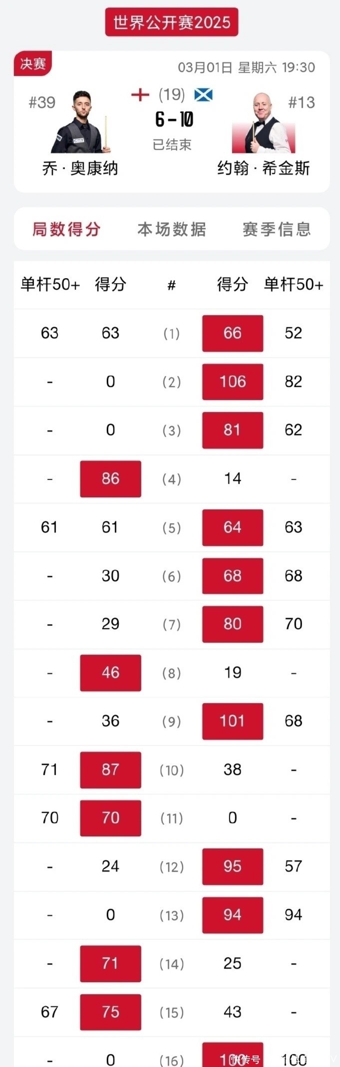 这场比赛,奥康纳一上来就以单杆62分强势开局,1-0、2-1、3-1、4-1,前五局的具体比分为:87(62)-36、1-107(61)、68(68)-37、93-21、78-4。